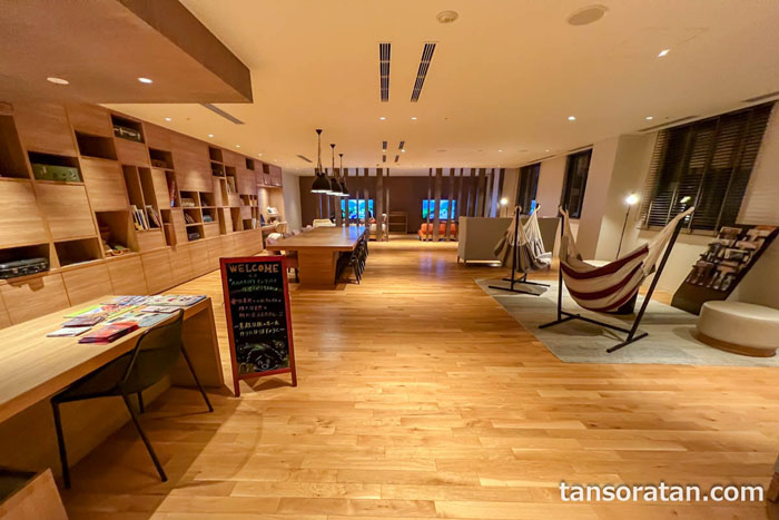 ハンモックやソファが並ぶフリースペースで、まるで森の中にいるかのようにゆったりと過ごせます。