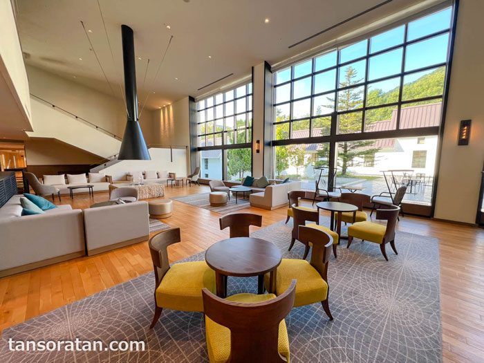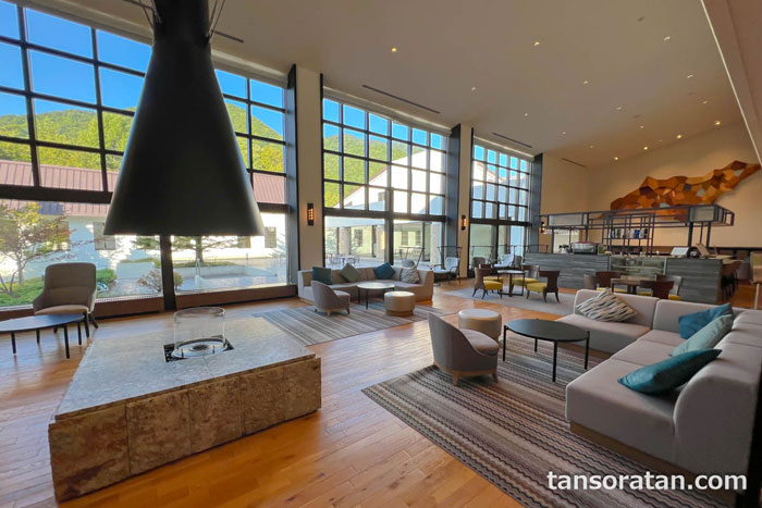 吹き抜け天井から注ぐ自然光と、暖炉のやわらかな灯りが象徴的なロビーラウンジです。