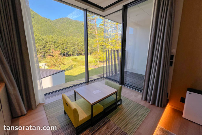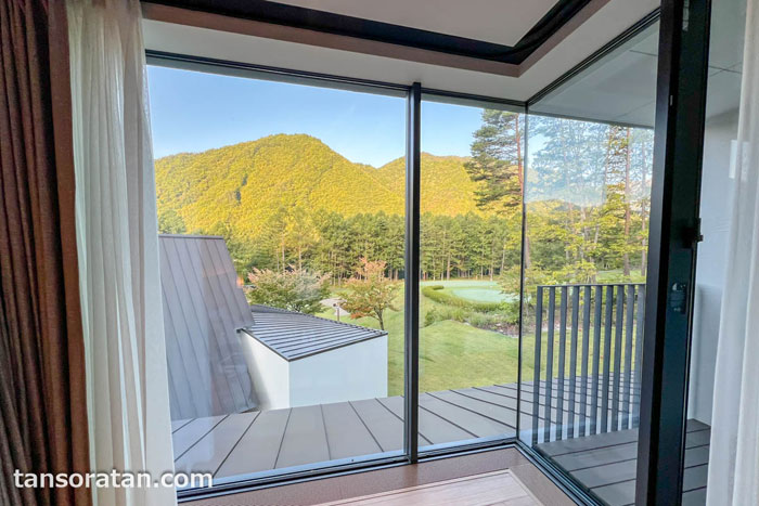 木の香りに包まれた客室、窓の向こうに広がる北アルプスの稜線。
