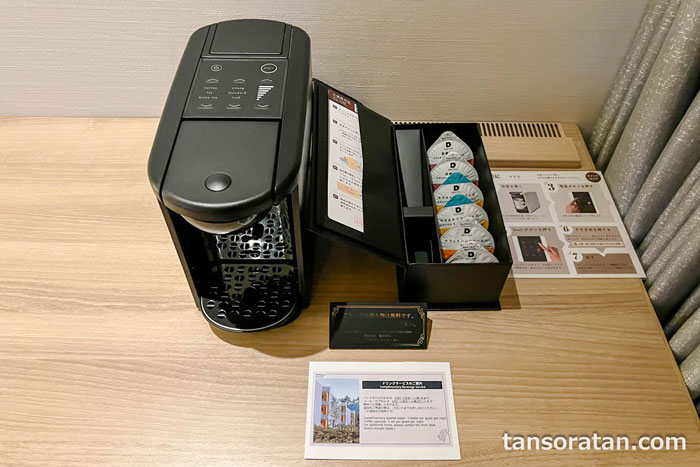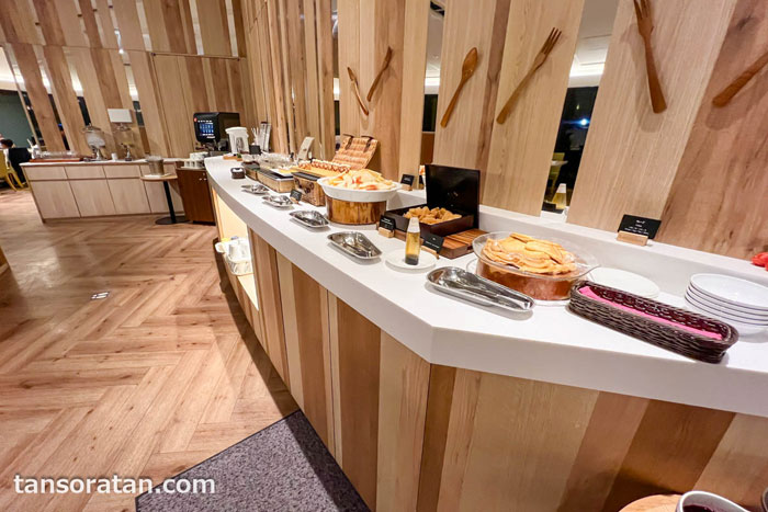 奥には無料のコーヒーとフルーツウォーターが用意され、ソフトドリンクやアルコールは追加注文または飲み放題プランも選べます。