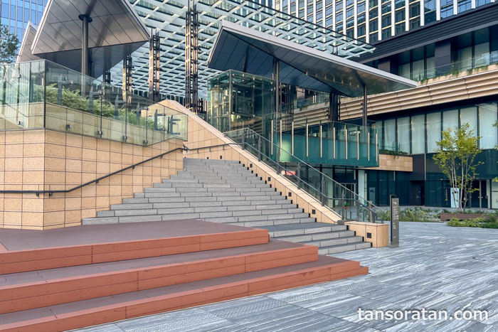 出口を出たら右へ。奥に見える階段方向に進みましょう。