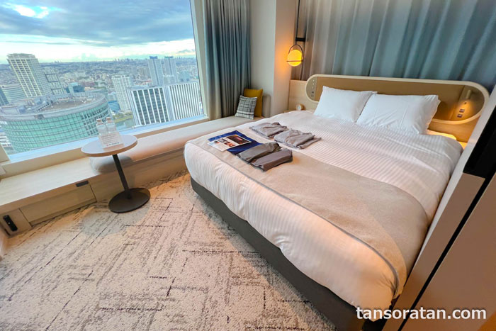 つい外の夜景に目を奪われがちですが、ベッドも主役級。