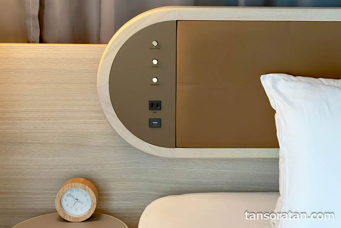 ベッドボードにはUSBポートと電源コンセント、さらに照明スイッチが集約されていて、機能性も抜群。