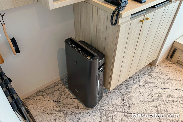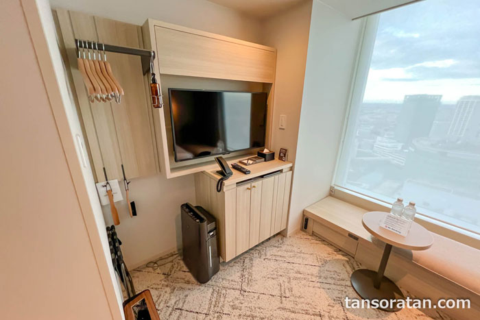 テレビの周りには、クローゼット・空気清浄機・ミニバーキャビネットがスマートに収められており、空間全体がスッキリと美しくまとまっています。