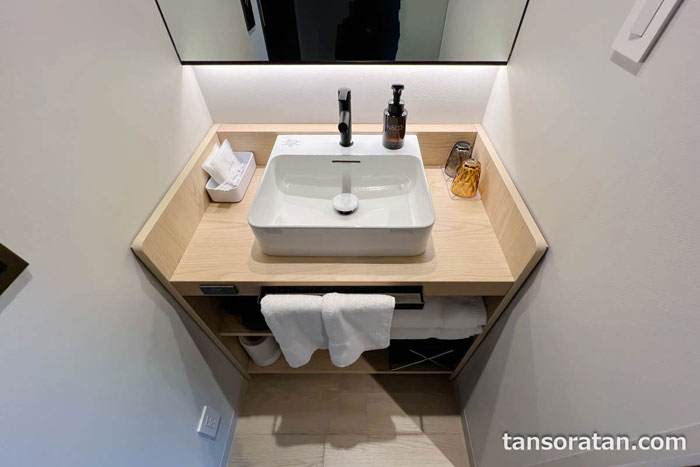 入口すぐ横の奥まったスペースには、シングルボウルの独立洗面台。