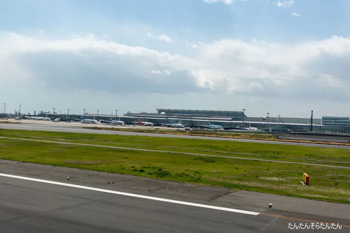 着陸後、緑広がる光景が成田に着いた事を感じます。